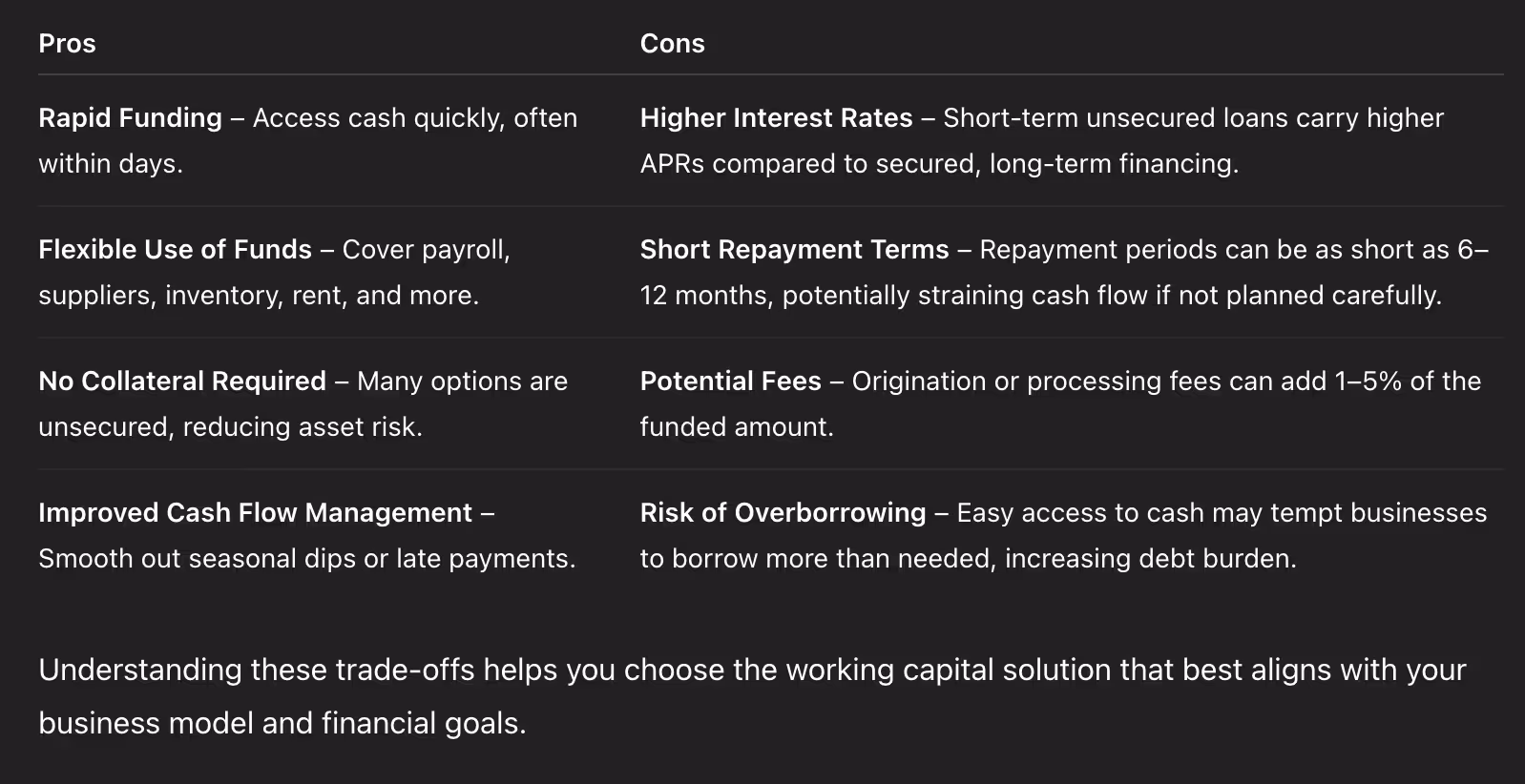 Understanding these trade-offs helps you choose the working capital solution that best aligns with your business model and financial goals.